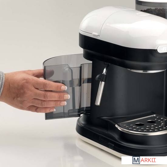 Съёмный резервуар для воды. Капли попадают в специальный съёмный поддон – на столешнице будет сухо и чисто. У этой модели механическое кнопочное управление, разобраться в настройках не составит труда. Одновременно можно приготовить две чашки. Через 30 минут простоя кофеварка автоматически отключается.Мощность: 920-1080 Вт.