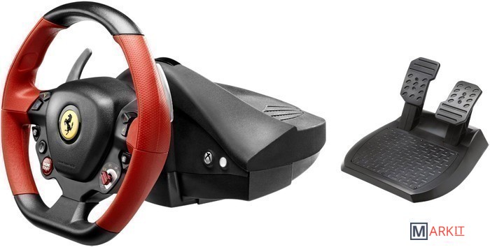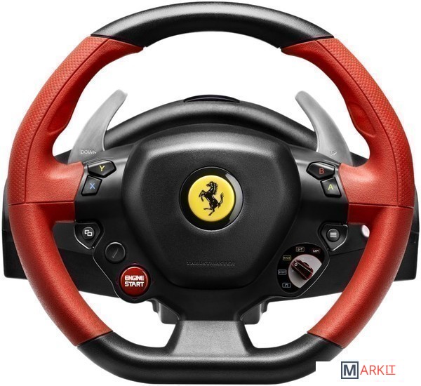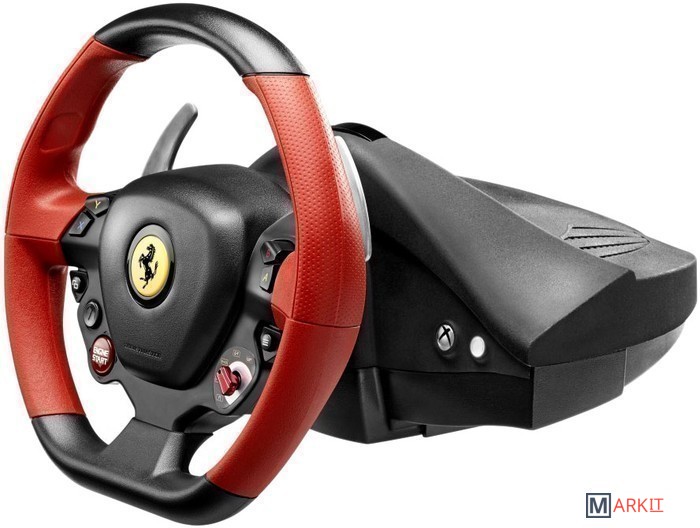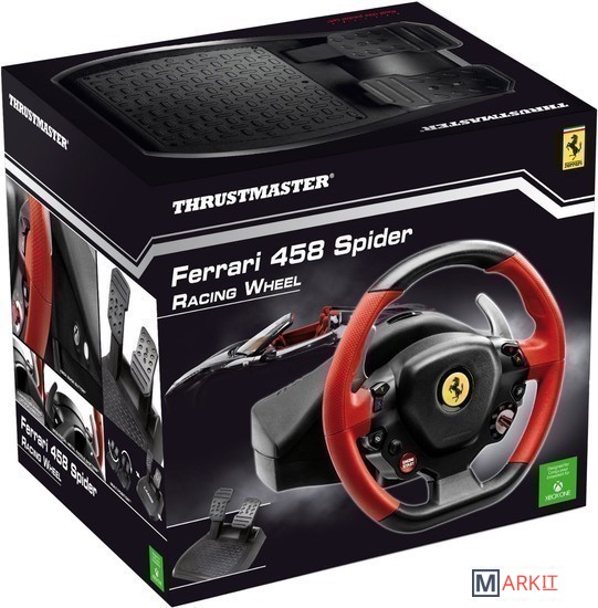 Руль является точной копией руля настоящего болида Ferrari 458 Spider в масштабе 7/10 (в диаметре 28 см). Спортивный GT стиль подчеркивается прорезиненным захватом, броским дизайном и красной текстурированной отделкой. Реалистичный облик устройства дополняют 2 металлических секвенционных переключателя скоростей расположенных на руле – Down и Up.Руль оснащен 9 функциональными кнопками, двухпозиционным переключателем Manettino, многопозиционной кнопкой ENGINE START и кнопкой Xbox Guide. В конструкции использована запатентованная система центрирования руля Thrustmaster и механизм Thrustmaster Bungee Cord. Угол поворота руля составляет 240 градусов.Рулевую систему можно индивидуально подстроить под свои запросы. Отрегулировать можно чувствительность рулевого управления, для неё существует 4 заданных настройки, с помощью которых осуществляется оптимизация функциональности руля с учетом типа трассы, предпочитаемого стиля вождения и автомобиля.Педальный блок получил большой упор для ноги. Регулировке поддается и угол наклона педалей, а педаль тормоза оснащена прогрессивным сопротивлением.