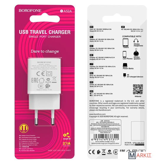 Markit » Зарядные устройства » Сетевое зарядное Borofone BA52A (белый)
