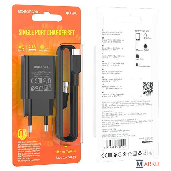 Markit » Зарядные устройства » Сетевое зарядное Borofone BA68A USB Type-C (черный)