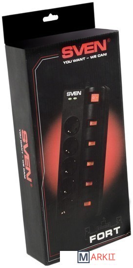 Компания SVEN представляет модель сетевого фильтра SVEN Fort. Этот фильтр является преемником широко известной модели фильтра Sven Platinum.Однако, дизайн и внутренняя схема имеют существенные изменения. Особое внимание уделено надёжности и безопасности эксплуатации. Электрическая схема выполнена по правилу варисторного треугольника с максимальной рассеиваемой энергией 1050 Дж и содержит защиту от перегрева свыше 100 °С.В модели появился общий выключатель, позволяющий включать или отключать все розетки одновременно. Важной особенностью является то, что как общий, так и индивидуальные выключатели являются двухполюсными - то есть, размыкают оба контакта, гарантируя двойную безопасность.