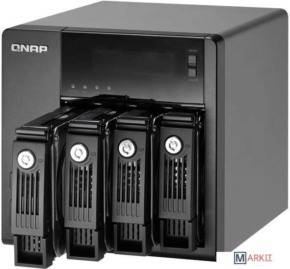 Сетевой RAID-накопитель с четырьмя отсеками для жестких дисков.