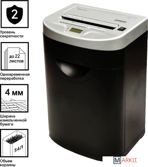 Уничтожитель документов (шредер) BRAUBERG S22 предназначен для уничтожения документов, компакт-дисков и пластиковых карт (банковских, дисконтных и прочих), потерявших актуальность.Отлично подходит для интенсивного персонального использования или коллективного использования в среднем офисе. Резка на полоски размером 4 мм обеспечивает P-2 уровень секретности (DIN 66399). Рекомендуемое количество пользователей — до 10 человек. За один раз уничтожает 22 листа формата А4. Объем корзины составляет 34 л.Дополнительным преимуществом данной модели является наличие функции энергосберегающего режима, т. е. когда аппарат не используется некоторое время — он находится в режиме готовности, но при этом снижается потребление энергии. Аппарат включится автоматически в момент начала уничтожения бумаги/компакт-диска/пластиковой карты.Данный уничтожитель снабжен надежными ножами, способными уничтожать скобы от степлера, что облегчает уничтожение скрепленных документов, экономя время потребителя. Отличительной чертой уничтожителя документов BRAUBERG является низкий уровень шума — всего до 56 Дб, т. е. тише, чем звук, издаваемый электробритвой. Шредер оснащен защитой двигателя от перегрева, что является частой причиной выхода из строя этой дорогостоящей запчасти на уничтожителях бумаги других производителей. Под входом для пластиковых карт/компакт-дисков предусмотрена отдельная небольшая корзина для того, чтобы отходы от карт и дисков не смешивались с отходами от бумаги, уничтожаемой через основной вход. Уничтожитель можно легко перемещать по офису, поскольку он оснащен колесами. При его установке в определенном месте можно зафиксировать передние колеса, чтобы шредер не перемещался.