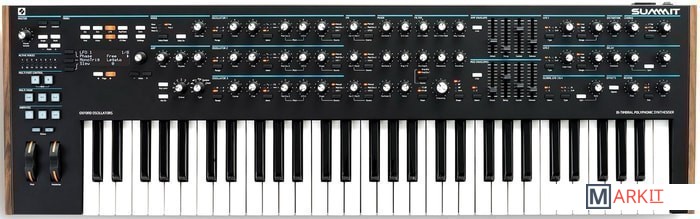 16-голосный полифонический синтезатор Summit основан на модели Peak, оснащен мультитембральным сдвоенным движком и предлагает субтрактивный, FM и волновой типы синтеза звука.Novation Summit оснащается 61 клавишной полувзвешенной клавиатурой с эффектом послекасания, большим набором управляющих кнопок и регуляторов, 8 фейдерами, колесами pitch/mod и небольшим дисплеем. Синтезатор генерирует звук через цифровые осцилляторы New Oxford на микросхеме FPGA. Каждый голос инструмента поддерживает до трех осцилляторов, работающих в режиме аналоговой эмуляции.Summit предоставляет возможность разделения голосов на 2 движка, что позволяет использовать несколько звуковых инструментов на клавиатуре, а также одновременно с использованием звука синтезатора задействовать процессор эффектов для внешних подключаемых инструментов. Summit имеет два фильтра, аналоговые VCA для каждого голоса, два генератора ADSR-огибающих, 4 LFO и аналоговый дисторшн.