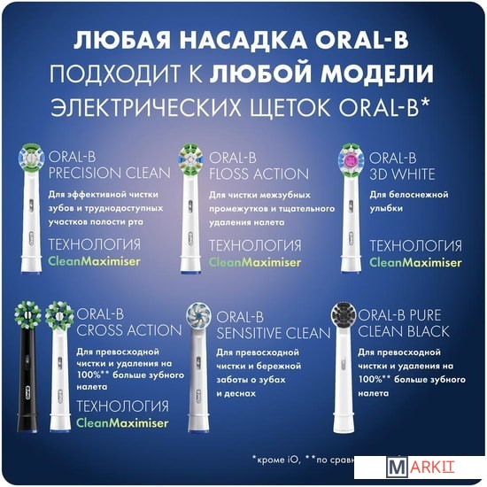 | Совместимые модели | Подходит ко всем электрическим зубным щеткам Oral-B, кроме звуковых электрических зубных щеток Oral-B Sonic/Pulsonic, а также Oral-B iO Series. |