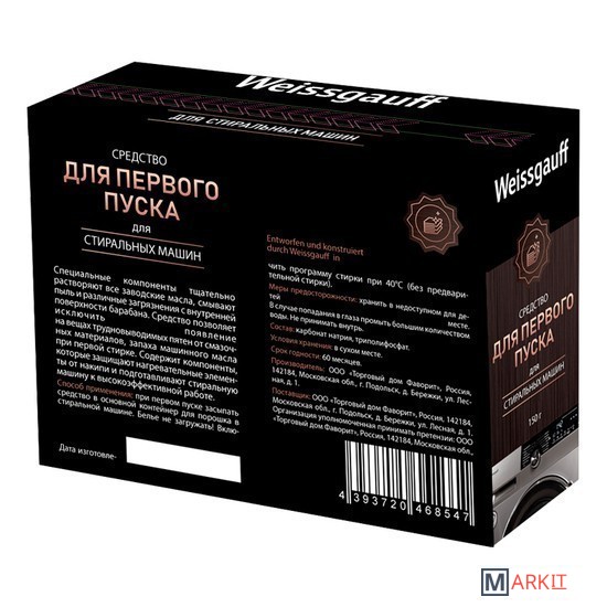 Средство для первого пуска стиральной машины Weissgauff WG 843Специальные компоненты тщательно растворяют все заводские масла, смывают пыль и различные загрязнения с внутренней поверхности барабана. Средство позволяет исключить появление на вещах трудновыводимых пятен от смазочных материалов, запаха машинного масла при первой стирке. Содержит компоненты, которые защищают нагревательные элементы от накипи и подготавливают стиральную машину к высокоэффективной работе. Способ применения: при первом пуске засыпать средство в основной контейнер для порошка в стиральной машине. Белье не загружать! Включить программу стирки при 40°С (без предварительной стирки). Меры предосторожности: хранить в недоступном для детей месте. В случае попадания в глаза промыть большим количеством воды. Не принимать внутрь.