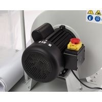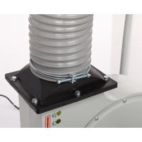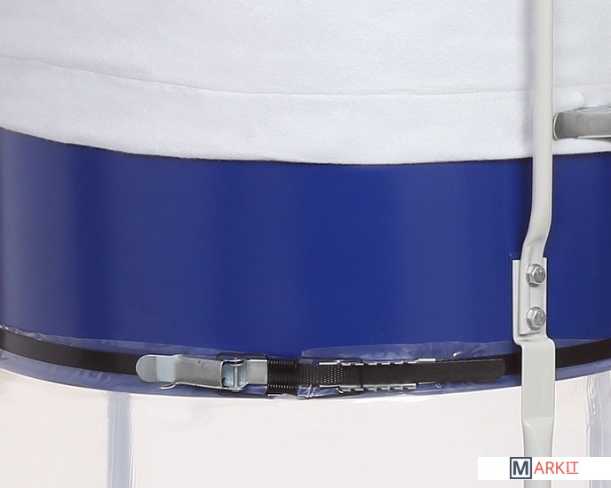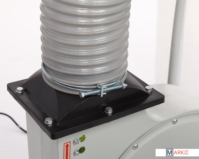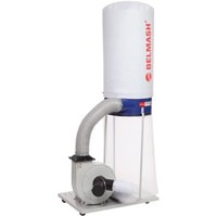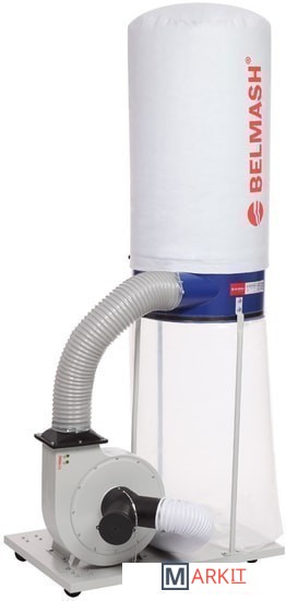 Модель BELMASH DC2500, мощностью 1500 Вт, имеет традиционную конструкцию: на платформе-основании размещены корпус установки с асинхронным двигателем и стойки. К выходному патрубку крепится отводящий пластиковый армированный шланг диаметром 125 мм, по которому воздух попадает в разделительный корпус. На входной патрубок (Ø100 мм) устанавливается адаптер, посредством которого вытяжку можно подключить сразу к двум точкам удаления отходов резания, мощности для этого достаточно.Фильтр-мешок и стружкосборник находятся на одной вертикальной оси и крепятся к корпусу-разделителю с помощью двух зажимов. Мешок из плотного нетканого материала подвешивается на крючок опоры.