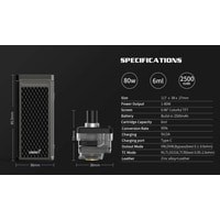 | Комплектация | - кабель для зарядки- картридж 6 мл- испаритель 0.3 Ом (предустановлен)- испаритель 0.6 Ом- документация |
