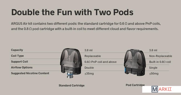 - картридж 2 мл (с узким отверстием воздуховода)- картридж 2 мл (с широким отверстием воздуховода)- испаритель 0.6 Ом- испаритель 0.8 Ом- кабель для зарядки (USB Type-C)- документация |