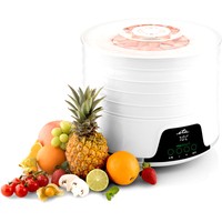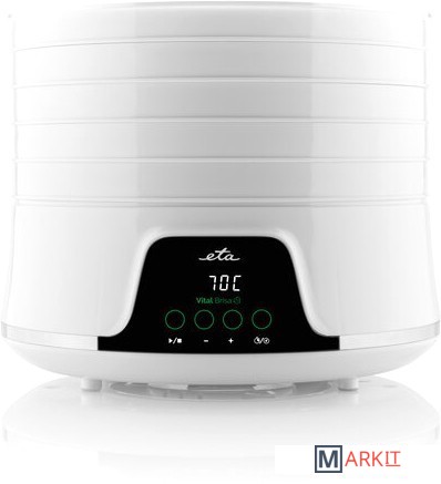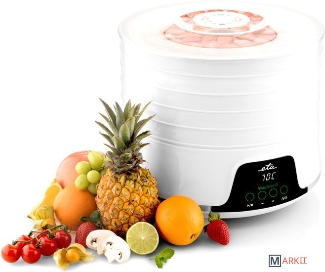 Здоровый способ приготовления и хранения пищиПодходит для сушки фруктов, овощей, грибов, мяса (домашнее вяленое мясо), рыбы и зелени.Светодиодный дисплейЗвуковая сигнализацияТаймер от 0,5 до 19,5 часов с шагом 0,5 часаБольшой диаметр 32 см гарантирует оптимальное пространство для обезвоживания.0,34 м2 активной зоны осушения (при использовании 5 противней)Количество подносов можно регулировать в зависимости от количества еды - простая и удобная манипуляцияПоднос для травНескользящие ножки обеспечивают устойчивостьЗащита от перегреваОчень быстрая сборка, простое управление и легкое обслуживаниеПрактичная форма и дизайнТихий режимМесто для намотки шнура питанияДлина шнура питания 1 мПотребляемая мощность 500 ВтМожно приобрести дополнительные лотки.Дополнительные аксессуары:Лоток ETA130200020Поднос для трав ETA130200030Поднос для фруктов ETA130200040