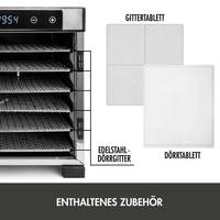 Светодиодный дисплей, 24-часовой таймер с автоматическим отключением6 сушильных решеток из нержавеющей стали, площадь сушки 990 см² на решетку, общая площадь 5940 см²1 сушильный лоток, например, для намазывания фруктовой массы для приготовления фруктовой кожицы1 сетчатый лоток, идеально подходящий, например, для трав, ягод или цветов1 форма для батончиков мюсли на 15 батончиков домашнего приготовленияКорпус из нержавеющей стали, 600 ВтНасадки можно мыть в посудомоечной машинеДлина шнура питания: прибл. 105 см