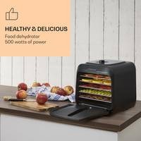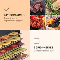 Klarstein Флорида солонина Дегидратор сушит фрукты, овощи, мясо и другие пищевые продукты с использованием инфракрасной технологии при скорости записи, что позволяет производство натуральных фруктов и ингредиентов.Благодаря тепловой мощности 500 Вт с инфракрасной технологией и равномерным распределением тепла, Флорида Jerky сушки машина гарантирует , что плоды высушенные таким же образом , как и в солнце, и само время сушки коротко. Важные минералы и витамины сохраняются во время сушки, а вкус становится более интенсивным. Благодаря полностью автоматическому процессу сушки с четырьмя выбираемыми программами фрукты, мясо, овощи или даже йогурт готовятся легко и без усилий. В дополнительном ручном режиме можно установить температуру от 35 до 75°С и время от 1 до 99 часов.Очистить сушильную машину после окончания процесса очень просто: внутреннюю часть корпуса и сетчатые полки можно без проблем промыть. Корпус изготовлен из прочного пластика и легко моется снаружи.Размеры одной полки: примерно 30 x 24 см (Ш x Г)Длина шнура питания: около 120 см.С воздушным фильтромЖК дисплейЭлектропитание: 220-240 В ~ | 50/60 Гц