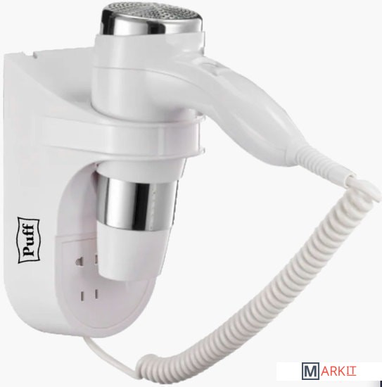 Фен для волос Puff-1600B предназначен для стационарного монтажа в туалетных и ванных комнатах. Включение кнопкой на ручке. 2 температурных режима работы. Встроенная розетка.