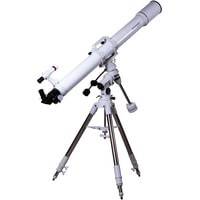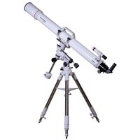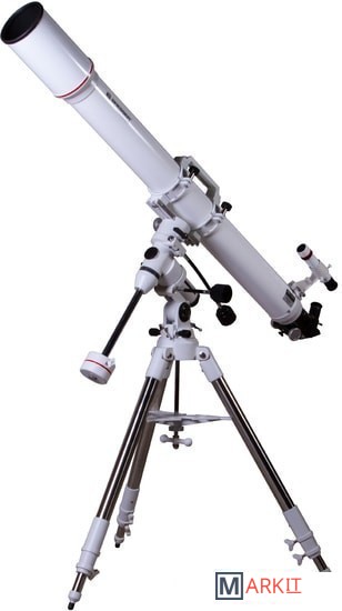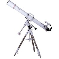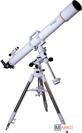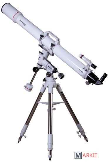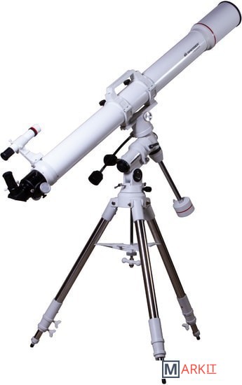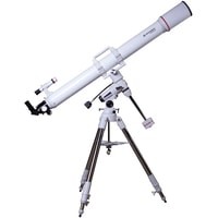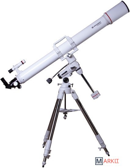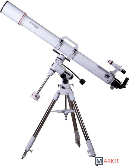 Рефрактор-ахромат Bresser Messier AR-102L/1350 EXOS-1/EQ4 – телескоп, который подходит для наблюдения объектов ближнего космоса. Улучшенный фокусер Hexafoc с увеличенным световым диаметром позволяет максимально эффективно использовать широкоугольные окуляры, так как убирает виньетирование по краям картинки. Благодаря этому телескоп хорошо проявляет себя при изучении протяженных астрономических объектов.Ахроматическая оптика минимизирует цветовые искажения, делает контуры звезд и планет более четкими и ясными. В картинке практически отсутствуют цветные ореолы вокруг ярких объектов, ночное небо выглядит контрастным, детали просматриваются подробно. Можно использовать оптические аксессуары с посадочным диаметром как 1,25, так и 2 дюйма. Для поиска объектов используется оптический искатель с перекрестьем.Оптическая труба устанавливается на монтировку при помощи колец с креплением «ласточкин хвост». В верхней части кольца объединены ручкой для переноски, которая снабжена держателем для фотокамеры.Монтировка фиксируется на стальной треноге, высоту которой можно регулировать. Между ножками располагается лоток для аксессуаров.