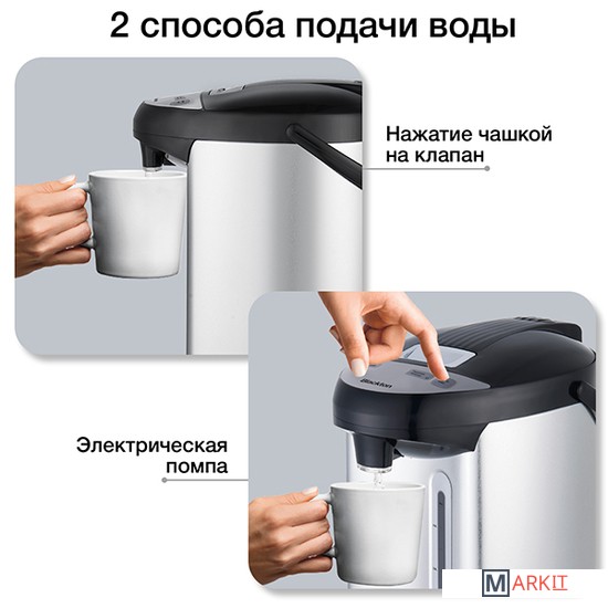 2 способа подачи воды: нажатием чашкой на клапан, электрическая помпа.Защита от включения без воды.Защита от перегрева.Блокировка крышки.Вращающийся корпус на 360°.