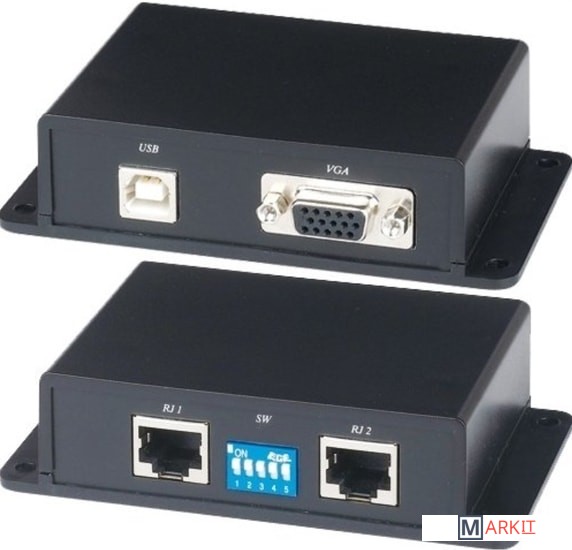 Удлинитель предназначен для подключения VGA-монитора к компьютеру на расстояние до 30 (100) метров по 4-х парному кабелю UTP категории 5. Удлинитель обеспечивает легкое и быстрое подключение VGA-монитора, клавиатуры и мыши к компьютеру, т. к. не требуется использование дорогостоящих кабелей для подключения этого оборудования. Комплект состоит из приёмника и передатчика.