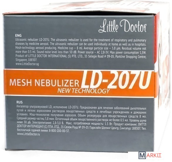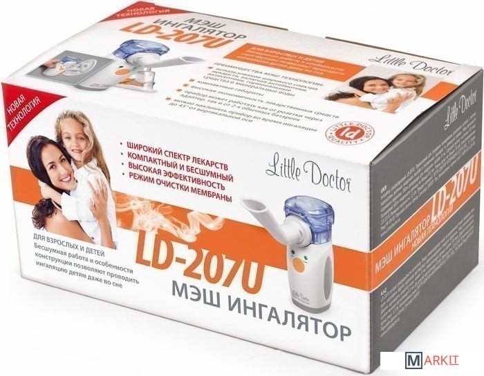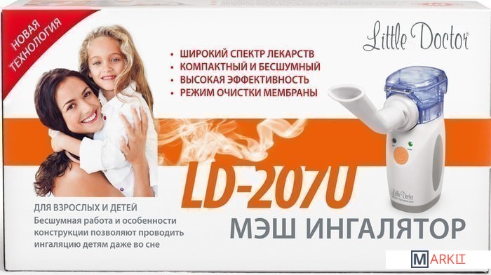 LD-207U – это ингалятор, в котором использована новейшая мэш-технология получения аэрозоля: с помощью сетчатой мембраны и ультразвукового генератора низкой частоты.• маленькие размер и вес;• работа прибора практически бесшумна и позволяет проводить ингаляции даже спящим детям;• широкий спектр лекарственных средств для ингаляционной терапии, включая антибиотики, антисептики и гормональные препараты;• практически нулевой остаточный объем лекарственных препаратов, что позволяет сократить потери лекарственных препаратов при его применении;• прибор может работать как от розетки через адаптер, так и от двух обычных батареек или аккумуляторов;Особенностью ингалятора является возможность производить ингаляцию под углом в 45 градусов от вертикальной оси и даже во сне.