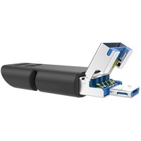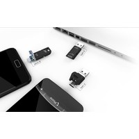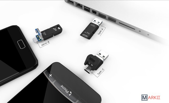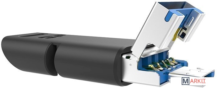 У накопителя OTG Mobile C50 есть три интерфейса – USB Type A, Type-C и micro-USB. Конструкцию данного накопителя можно назвать по-настоящему «умной». Интерфейс Type-C защищен прочным эластичным колпачком из ТПУ, способным выдержать более 10000 открытий и закрытий. Благодаря надежному креплению колпачка к накопителю больше не нужно волноваться, что колпачок потеряется. С другой стороны накопителя располагается интерфейс USB, который закрывает собой интерфейс micro-USB, когда последний не используется. Чтобы подключить накопитель к устройству на базе ОС Android, достаточно сдвинуть вверх интерфейс USB и подключить к устройству интерфейс micro-USB (работа по принципу plug-and-play).