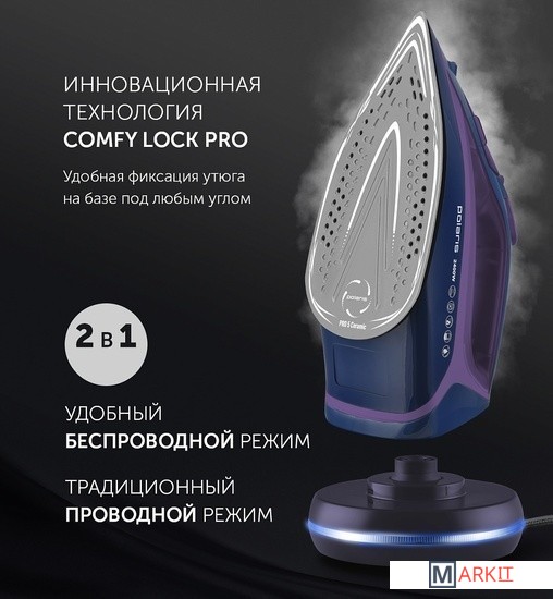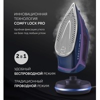 Инновационная технология COMFY LOCK PRO - удобная фиксация утюга на базе под любым углом.Система равномерного распределения тепла SMART HEAT.Быстрый нагрев в беспроводном режиме - 5 сек.Использование в автономном режиме до 40 сек.