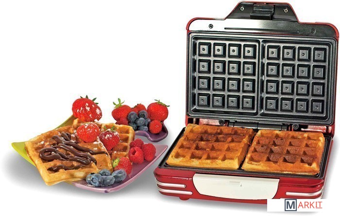 Дизайн вафельницы, как и всех устройств линейки Party Time, выполнен в стилистике 50-х годов прошлого века.Конструкция прибора позволяет печь одновременно пару пышных вафель квадратной формы. Благодаря антипригарным пластинам вафли подрумяниваются, но не пригорают.Готовить с 187 Waffle maker очень просто. Жидкое тесто для вафель подготовьте заранее. Включите прибор в сеть. О том, что пластины нагрелись и прибор готов к работе, сообщит световой индикатор на крышке вафельницы. Аккуратно заливайте тесто в формы и, закрыв крышку, ждите от 5 до 8 минут. Готовые вафли легко извлекаются. Вам останется только полить их шоколадом, ягодным соусом, медом и т.п.Вафельницу можно хранить в вертикальном положении, так она будет компактна и займет совсем немного места в ящиках на вашей кухне.