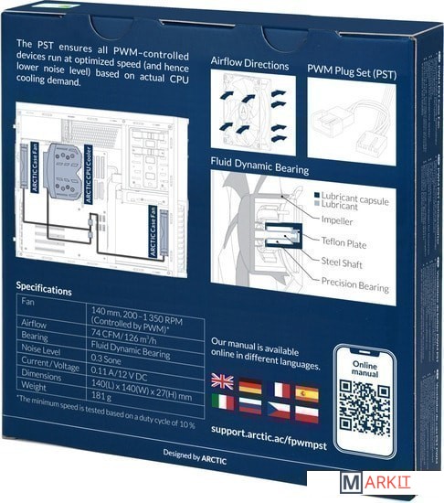 Вентилятор с поддержкой технологии PST от Arctic - возможность подключения цепочкой до 5 вентиляторов от одного 4pin разъема. Процессорный вентилятор должен быть последним в цепочке.