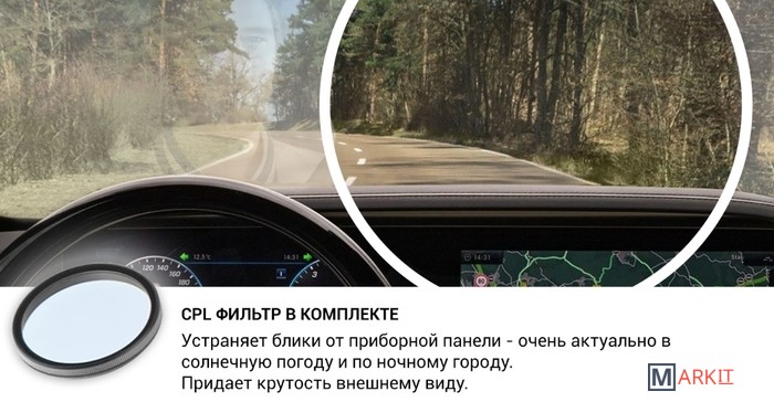 Комплектация - видеорегистратор;- камера заднего вида с креплением;- кабель для камеры заднего вида;- поляризационный фильтр (CPL);- крепление на присоске;- доп. крепление на 3М скотче;- автомобильное зарядное устройство;- салфетка для линзы и экрана.