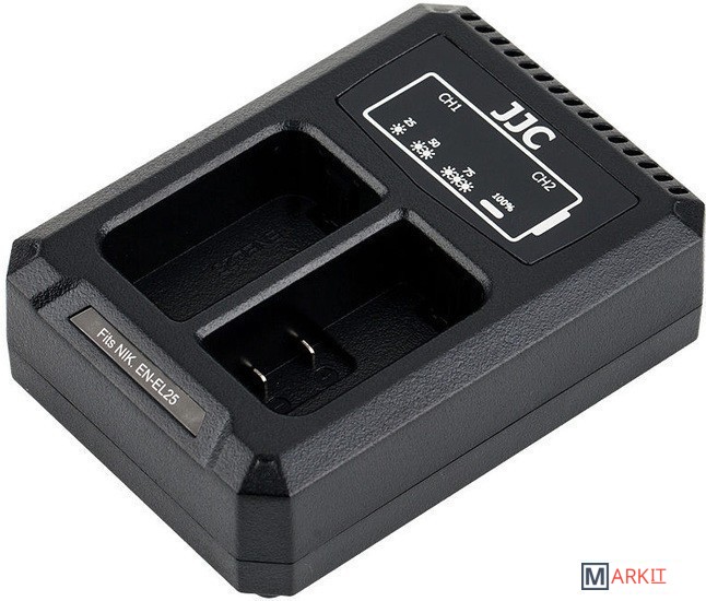 JJC DCH-ENEL25 USB двойное зарядное устройство на два аккумулятора Nikon EN-EL25 со встроенным USB кабелем и индикатором уровня зарядкиКомпактный дизайн, высокое качество, прочный корпусВремя зарядки зависит от емкости аккумулятораКомпактный и портативный дизайн. Индикатор мигает во время зарядки и постоянно горит когда аккумулятор заряжен. Так же дисплей зарядного устройства показывает процент заряда каждого аккумулятора. Вы можете заряжать как два аккумулятора, так и один.Встроенная система защиты от перезаряда и перегрева аккумулятора.Когда батарея только начинает перегреваться, зарядное устройство немедленно прекратит зарядку. Кроме того, зарядное устройство автоматически обнаружит когда батареи полностью заряжены и прекратит зарядку, чтобы предотвратить повреждение ваших аккумуляторов.Зарядное устройство подключается через USB порт, что позволяет заряжать аккумулятор от огромного числа устройств. Кабель USB интегрирован в корпус зарядного устройства и укладывается в специальные пазы корпуса. Заряжайте аккумулятор Nikon EN-EL25 дома, в студии и в дороге! (если в автомобиле есть USB разъем или USB адаптер в "прикуриватель").