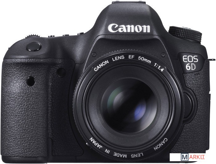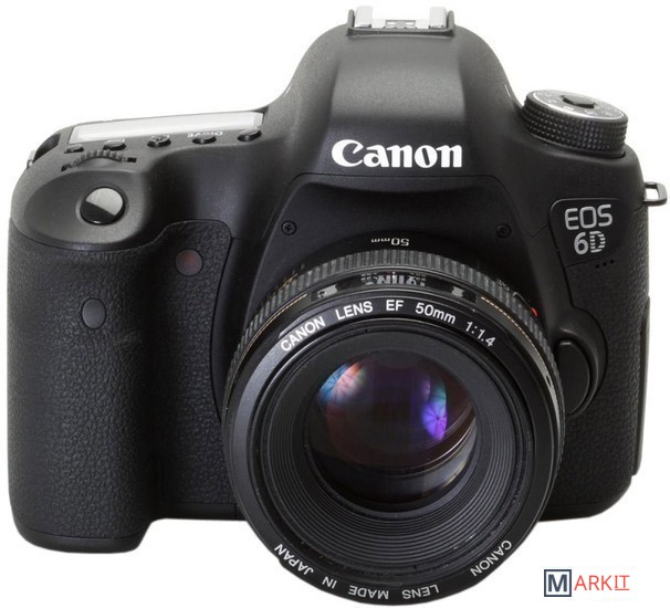 Цифровой зеркальный фотоаппарат семейства EOS компании, компактная и бюджетная модель с полнокадровой КМОП-матрицей (36x24 мм). Первый зеркальный фотоаппарат компании со встроенной поддержкой беспроводной передачи данных по технологии Wi-Fi и системы позиционирования GPS. По сравнению с EOS 5D Mark III, EOS 6D обладает упрощённой 11-точечной системой автофокусировки с центральной точкой крестового типа с чувствительностью до -3 EV, меньшим разрешением (20 мегапикселей вместо 22) и меньшей скоростью съёмки — 4.5 кадров в секунду вместо 6. Имеется только один разъём для карт памяти — Secure Digital. Комплект с объективом Canon EF 50mm f/1.4 USM.