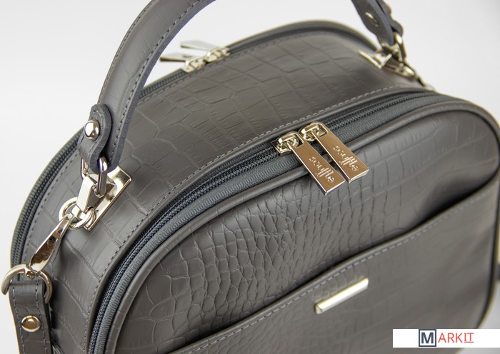 Сумка полужесткой конструкции из натуральной кожи.- Ручка крепится к ручкодержателям на хольнитены ;- Имеет 2 отделения закрывающие на застежку-молнию , 1 карман на молнии, карман для мобильного телефона, ручек и мелочи;- Украшение на переднем кармане;- На передней стенке расположен карман на магнитной кнопке;- Снаружи 1 карман быстрого доступа на молнии;- Съемные плечевой ремень на карабинах и регулируемой пряжкой.